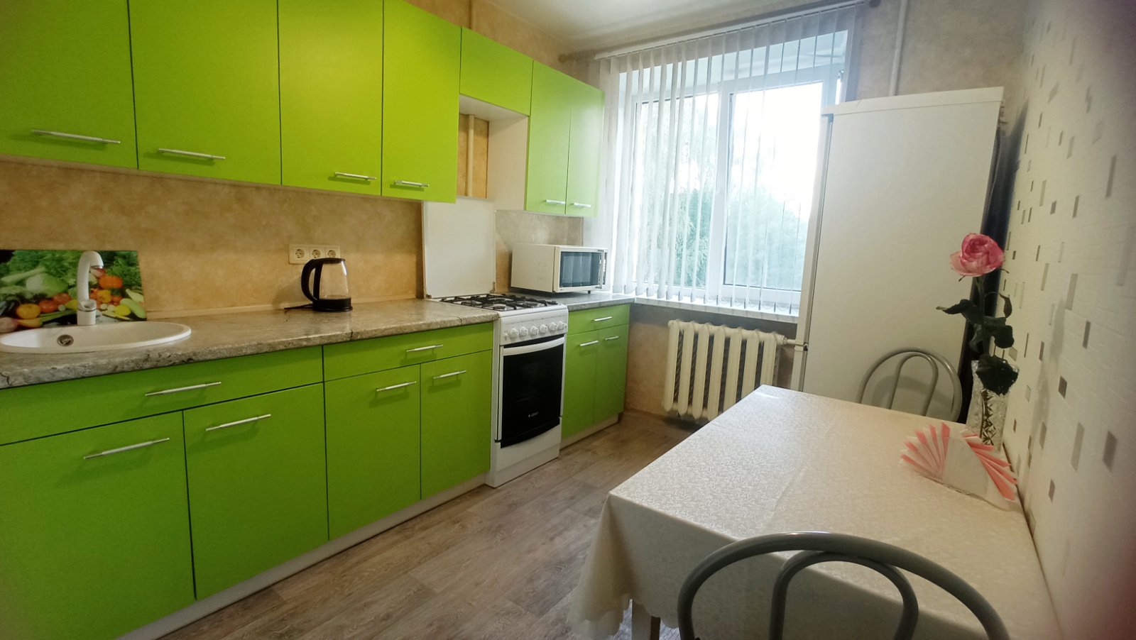На кухне есть всё необходимое для приготовления и употребление пищи.